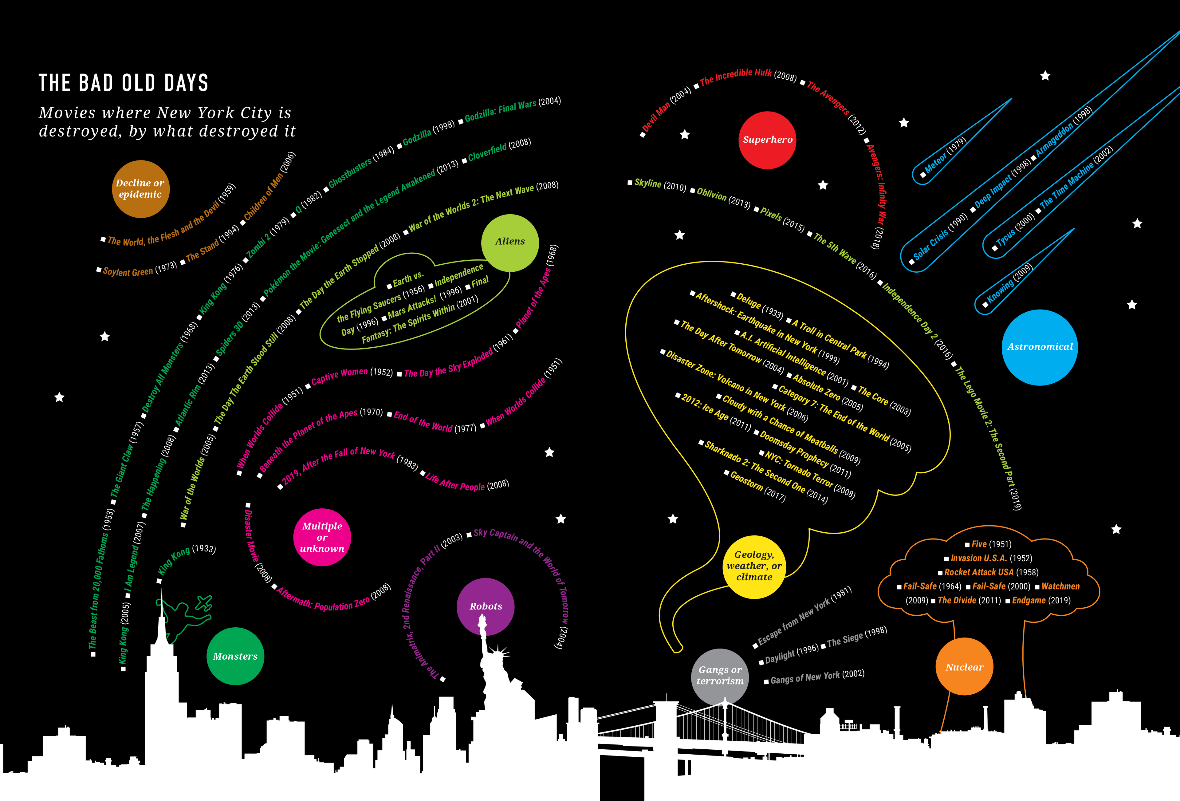 100+ graphics for the book release You Are What You Watch: How Movies and TV Affect Everything. The colorful graphics cover all the cool ways that movies impact everything: your body, brain, kids, identity, travel, sports, crime, spies, science, war, money, names, dogs, taxes, countries, friends, even enemies. Written by Walt Hickey For Workman Publishing.