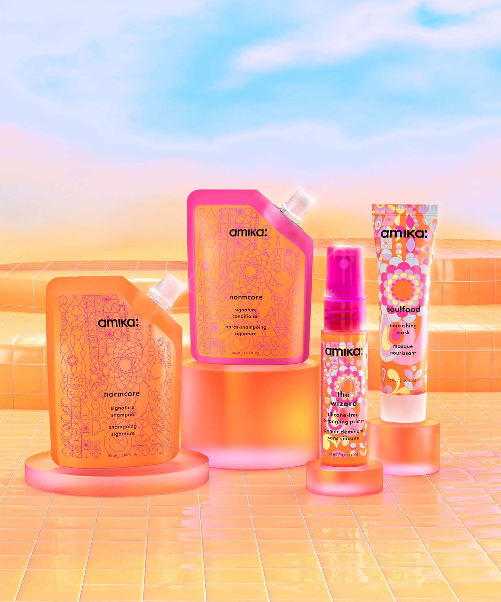 A series of 3D illustrations for Amika’s product packaging featuring the All-Stars, Signature Saviors, & Smooth Over Anti-Frizz sets.